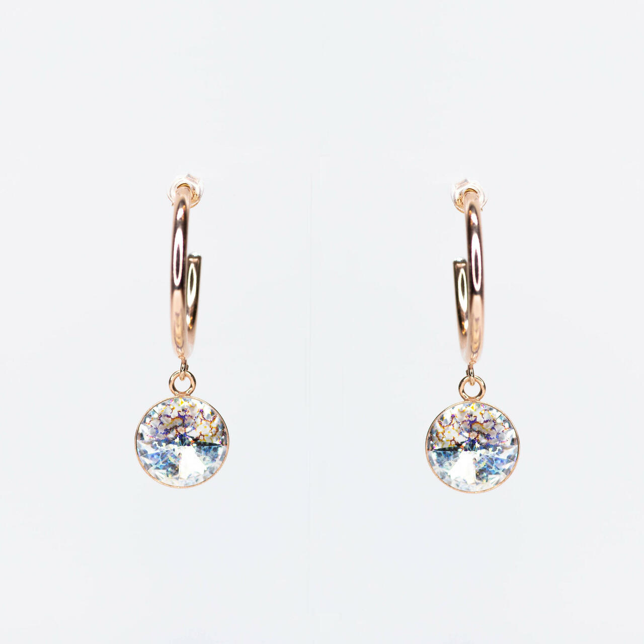 Swarovski kristallid on kinnitatud hõbepõhjale 925, mis on kaetud 18 karaadise rose gold tooni kullaga. Ehted on niklivabad. Kõrvarõngad jäävad kõrva peale liblikkinnitusega. Poolrõnga lõpus on 2mm suurune Swarovski kristall, mida otse vaates kohe näha ei ole, kuid annab erilise efekti.